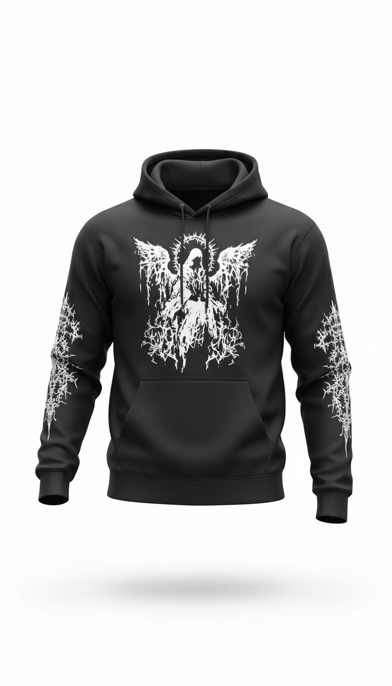 This hoodie features a powerful angel graphic on the front, surrounded by intricate gothic detailing and sleeve prints that elevate the overall design. The artwork creates a dramatic visual impact, making this hoodie a true statement piece in modern streetwear.